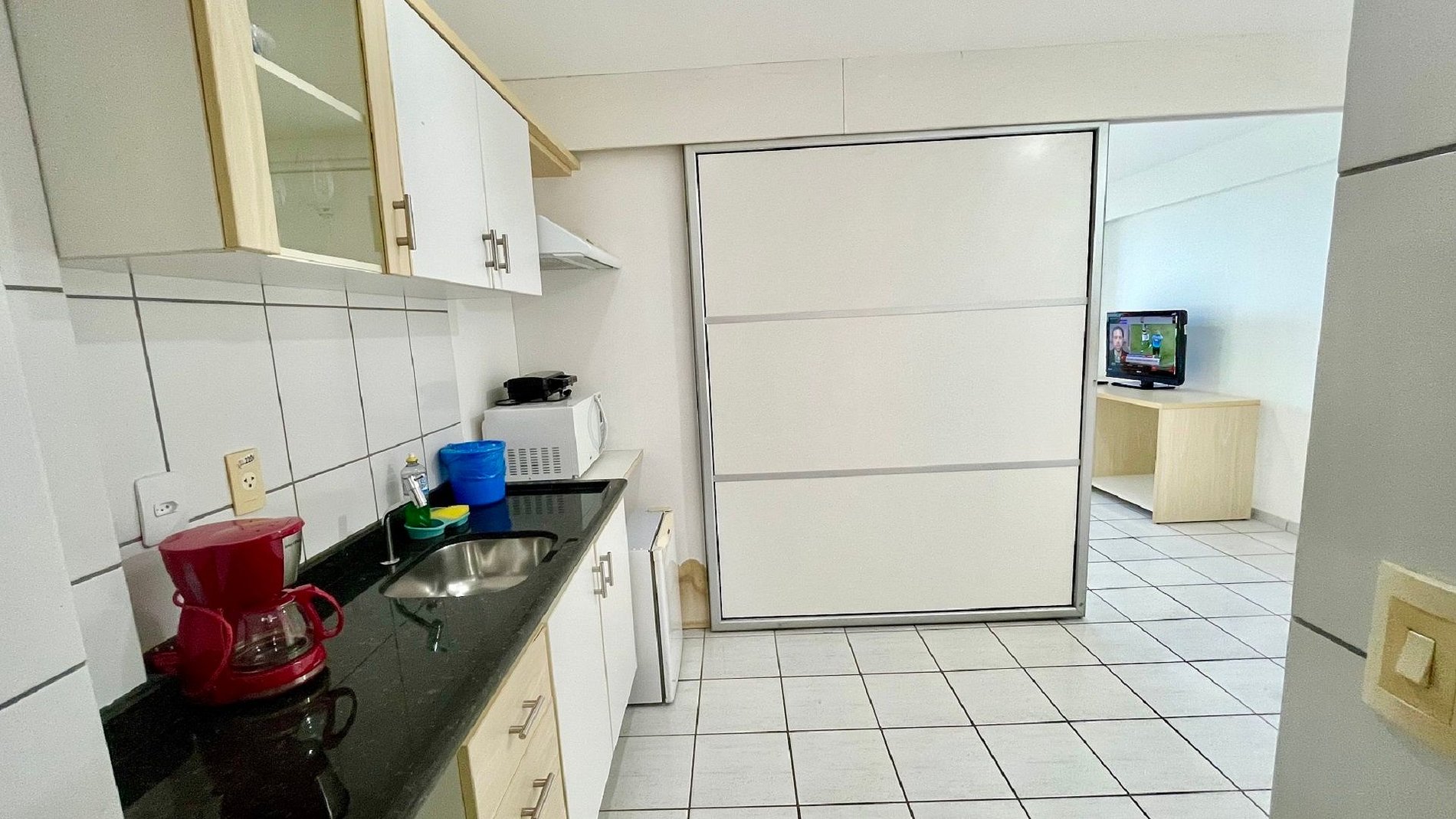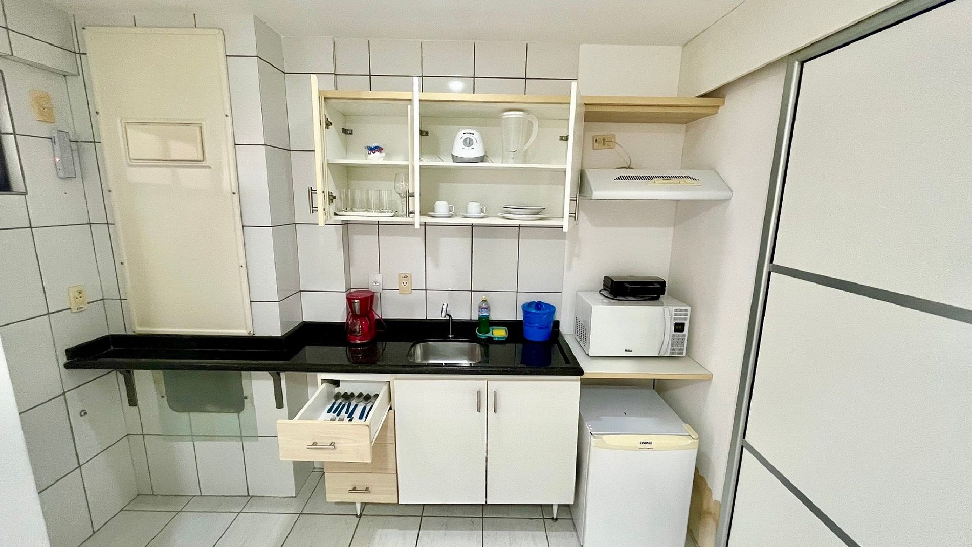 * Cozinha com Frigobar, Cafeteira, Microondas, Liquidifricador, Copos, Pratos, Talheres.