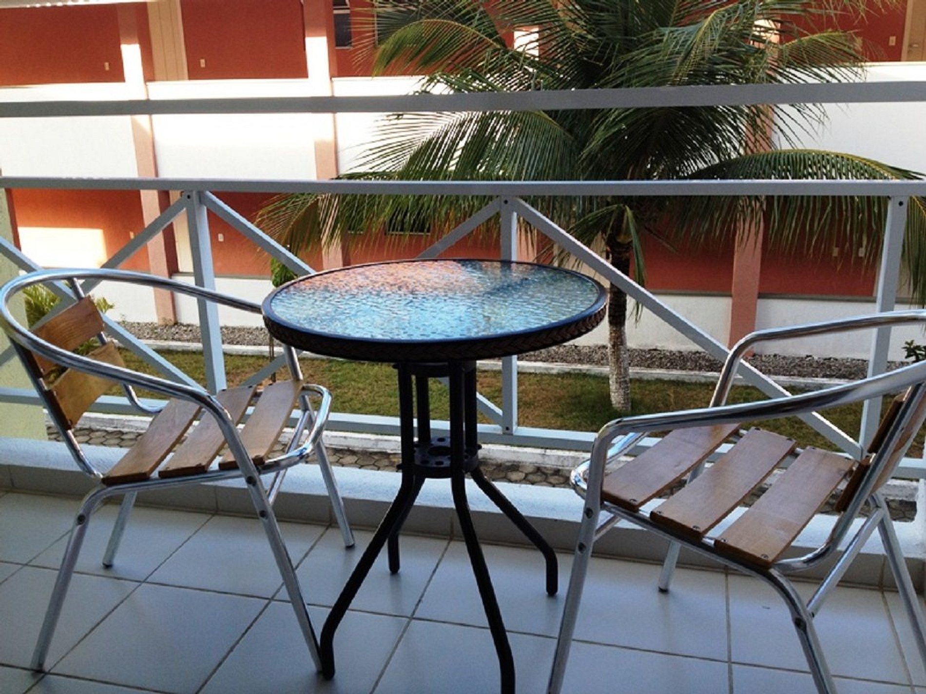 •Varanda com cadeiras e mesa.