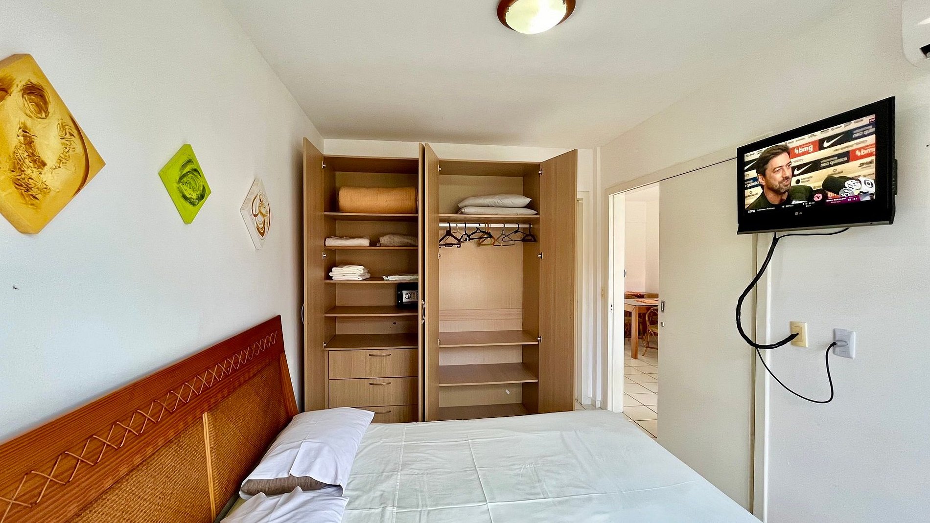 Suite com cama de casal, Ar acondicionado de split, Guarda-roupa com cabides. 2 Tv Led, cofre, Secador de Cabelho.