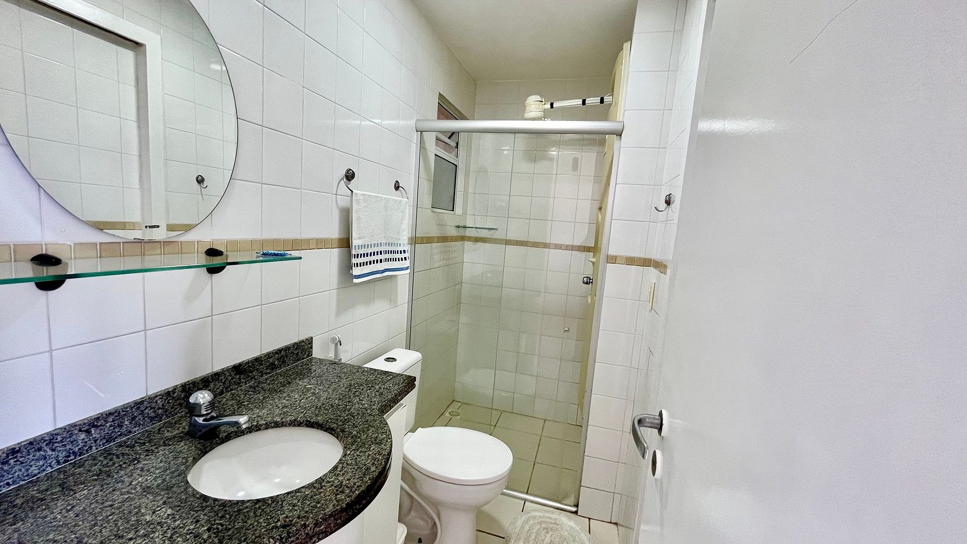 •Banheiro com chuveiro de agua quente. Toalhas, Ferro de pasar roupa.